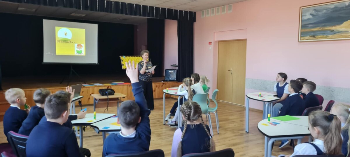 Podczas lekcji uczniowie wspólnie dyskutowali o znaczeniu czytania i dzielili się swoimi spostrzeżeniami, układali pocięte zdania we właściwej kolejności, czytali teksty z różnymi emocjami, a przedstawiciele każdej grupy zmierzyli się z trudnymi łamańcami językowymi.