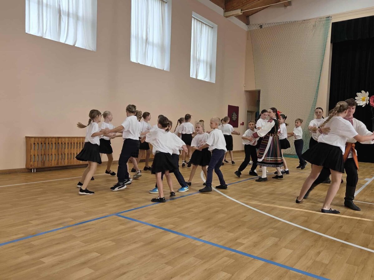 Zajęcia poprowadziły instruktorki Zespołu Pieśni i Tańca „Sokołowianie” – pani Iwona Kopiwoda oraz pani Anna Maliszewska. Co więcej, uczestnikom warsztatów towarzyszyli soliści i tancerze ZPiT „Sokołowianie”, którzy dzielili się swoim doświadczeniem i energią, inspirując młodzież do wspólnej zabawy i nauki. Dzięki ich obecności zajęcia nabrały wyjątkowego charakteru, a uczniowie mogli poczuć atmosferę prawdziwego zespołu ludowego.