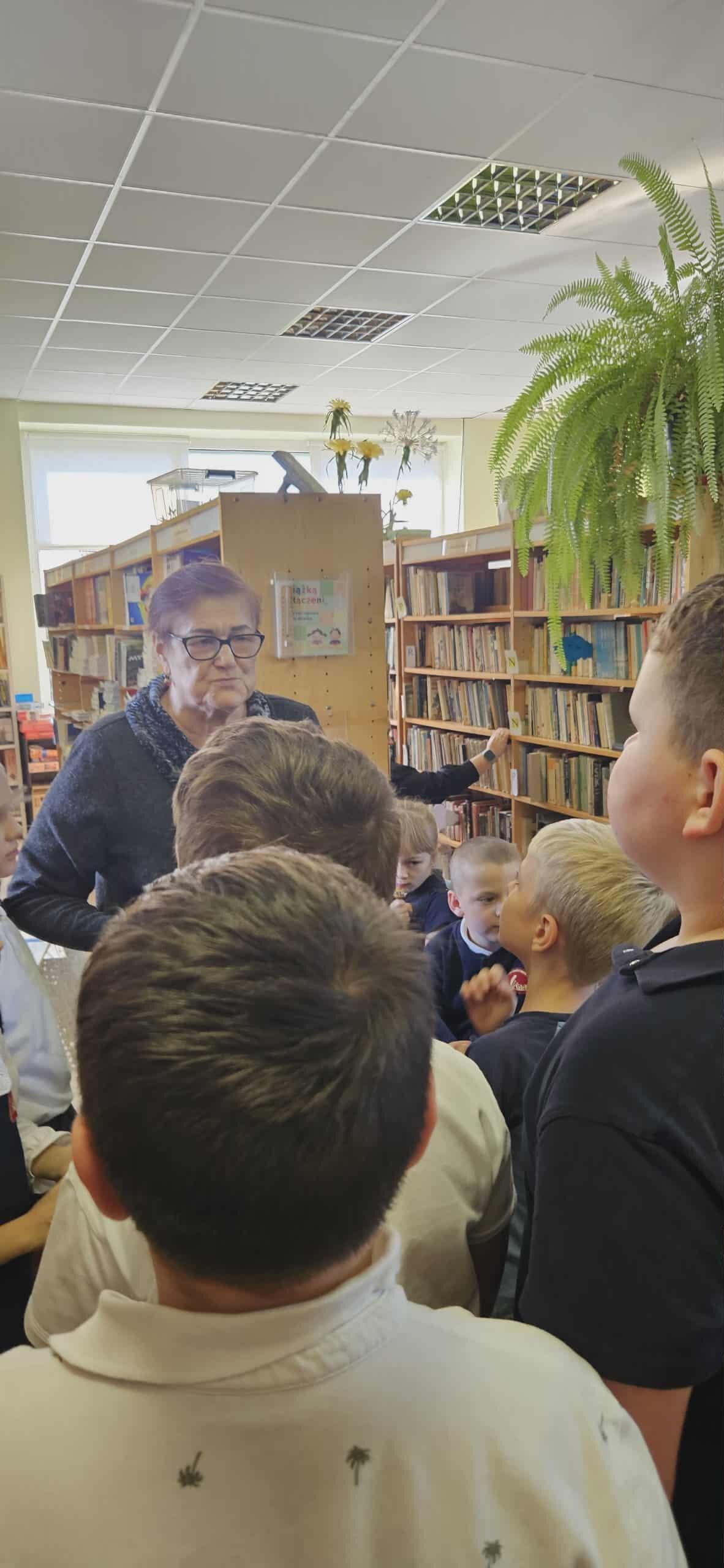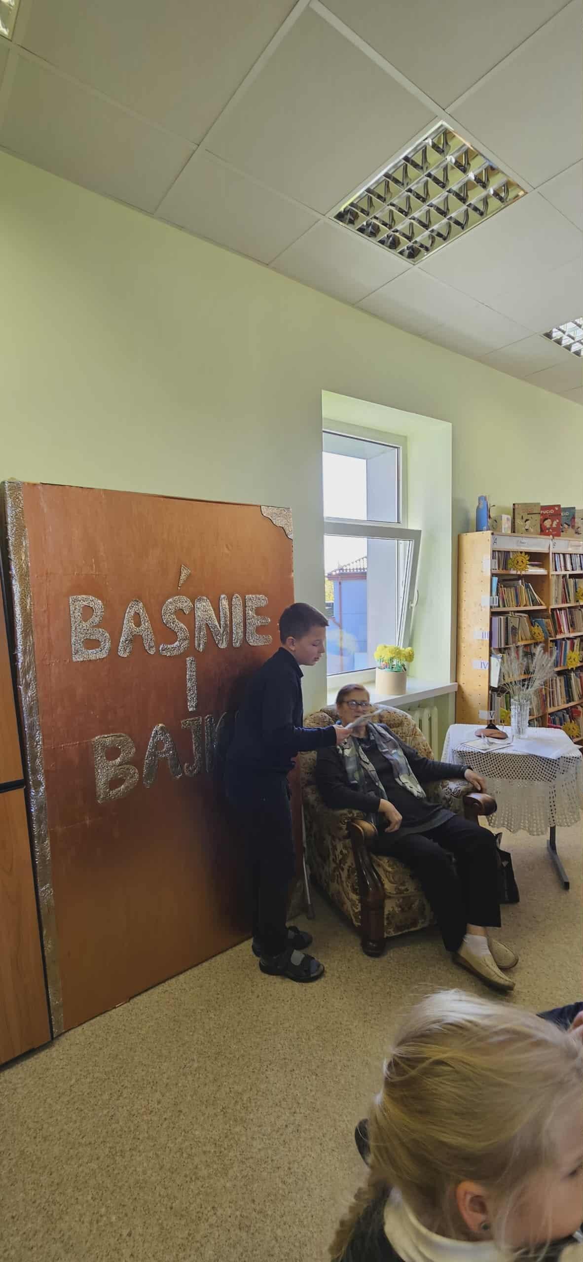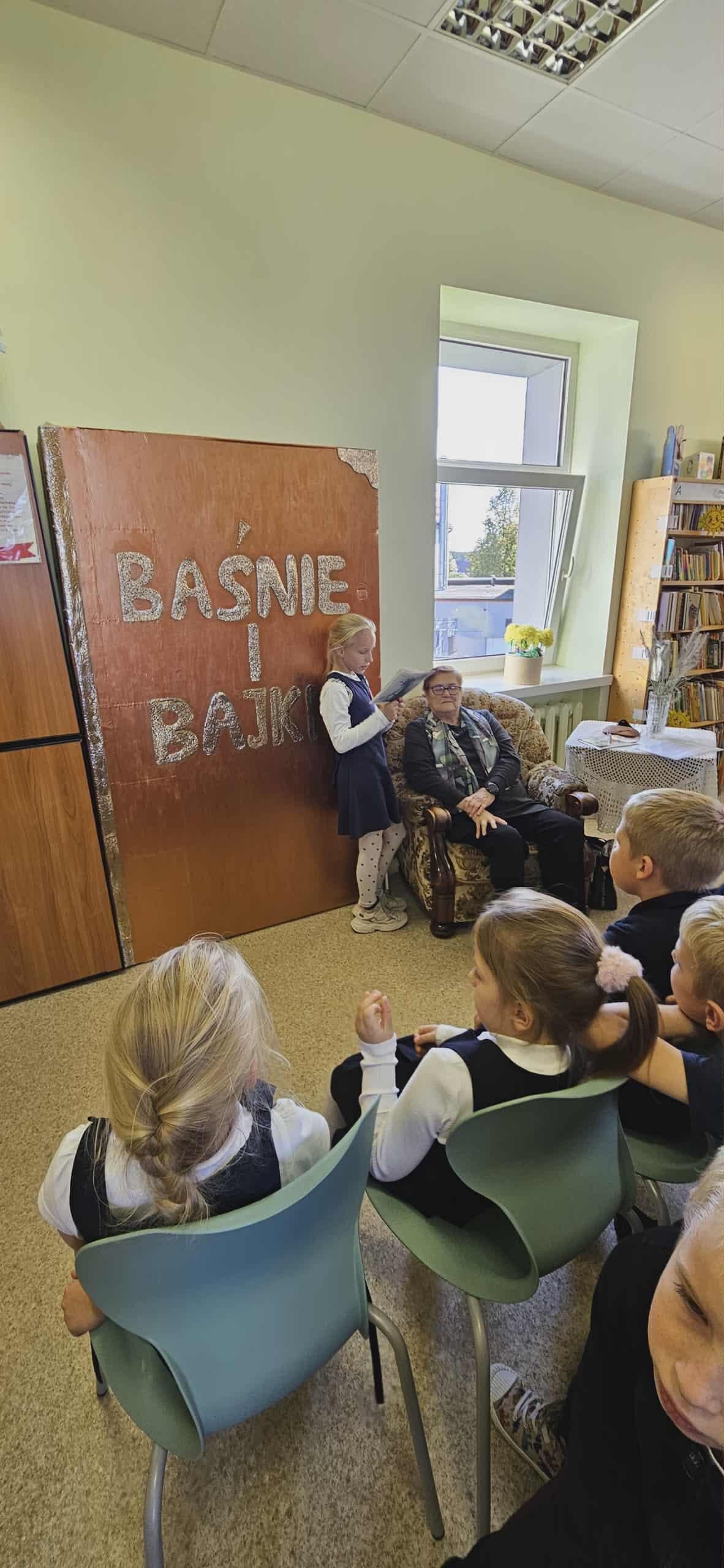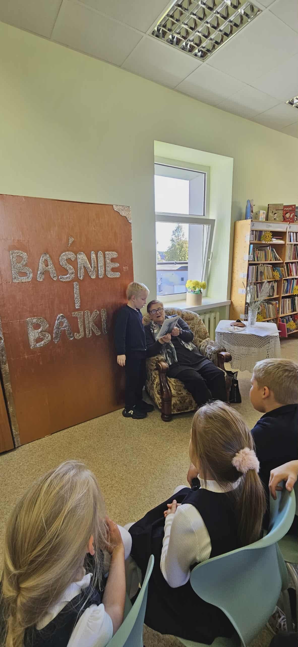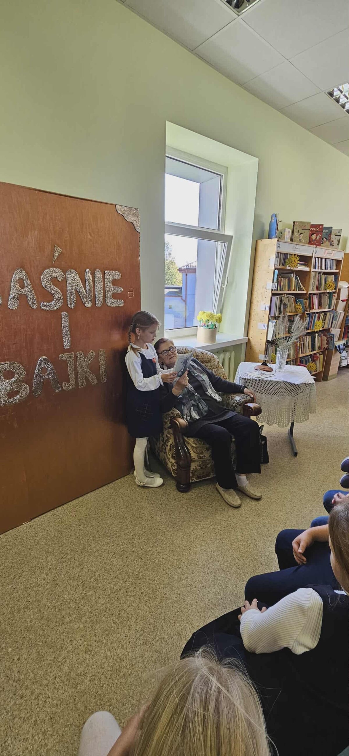 Dzisiaj, podobnie jak w ubiegłym roku szkolnym, do biblioteki Gimnazjum im. Longina Komolowskiego zawitała Babunia. Przeczytała uczniom klas 1–4 bajkę o topielcu, który chciał się ożenić. Dzieci z zachwytem słuchały opowieści, a następnie same, na zmianę, czytały dla Babuni.