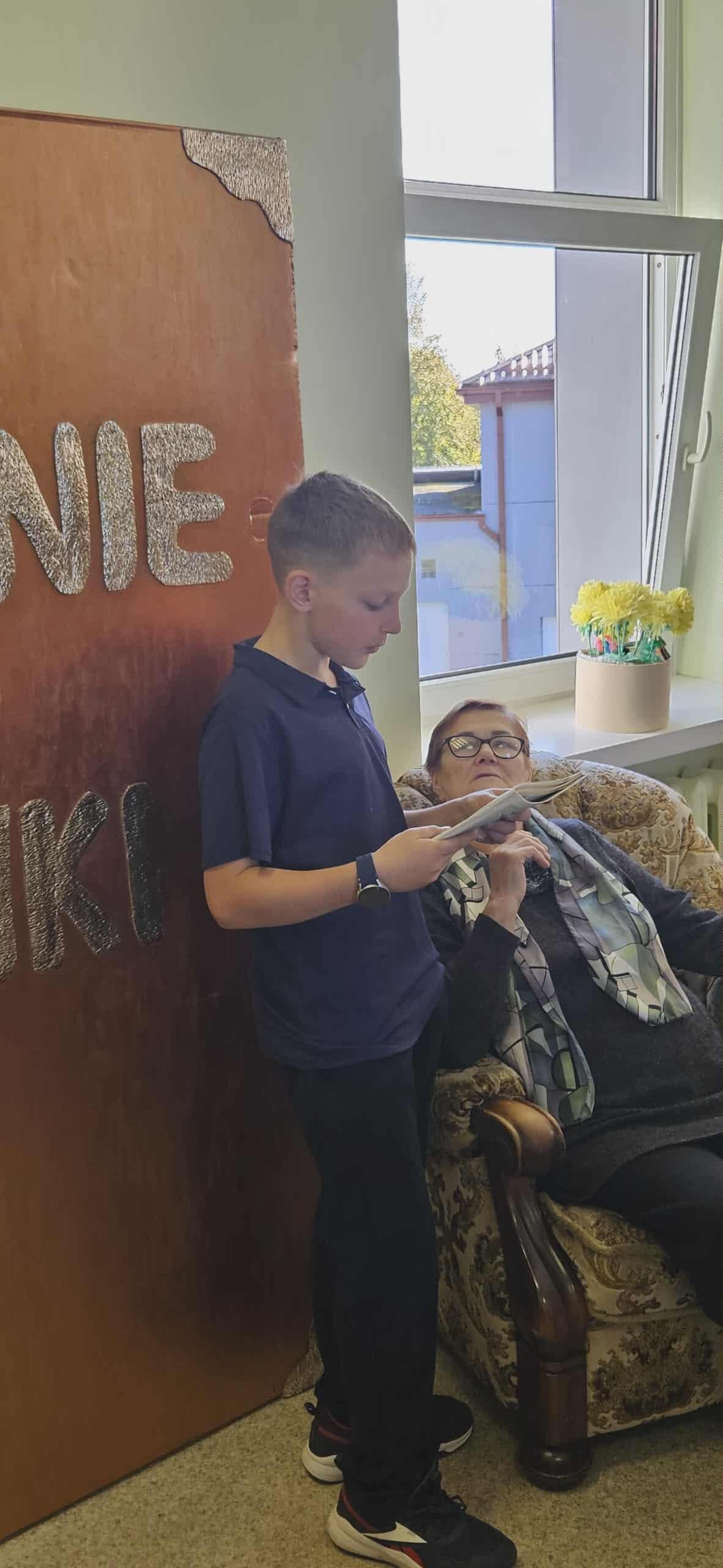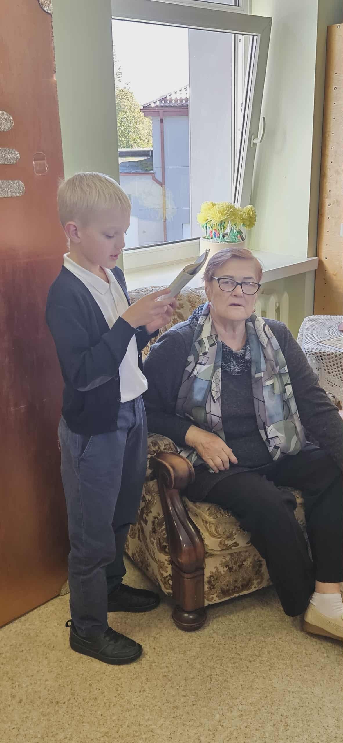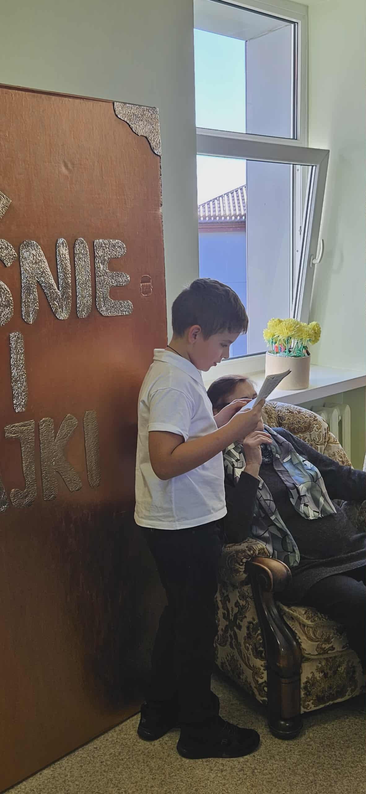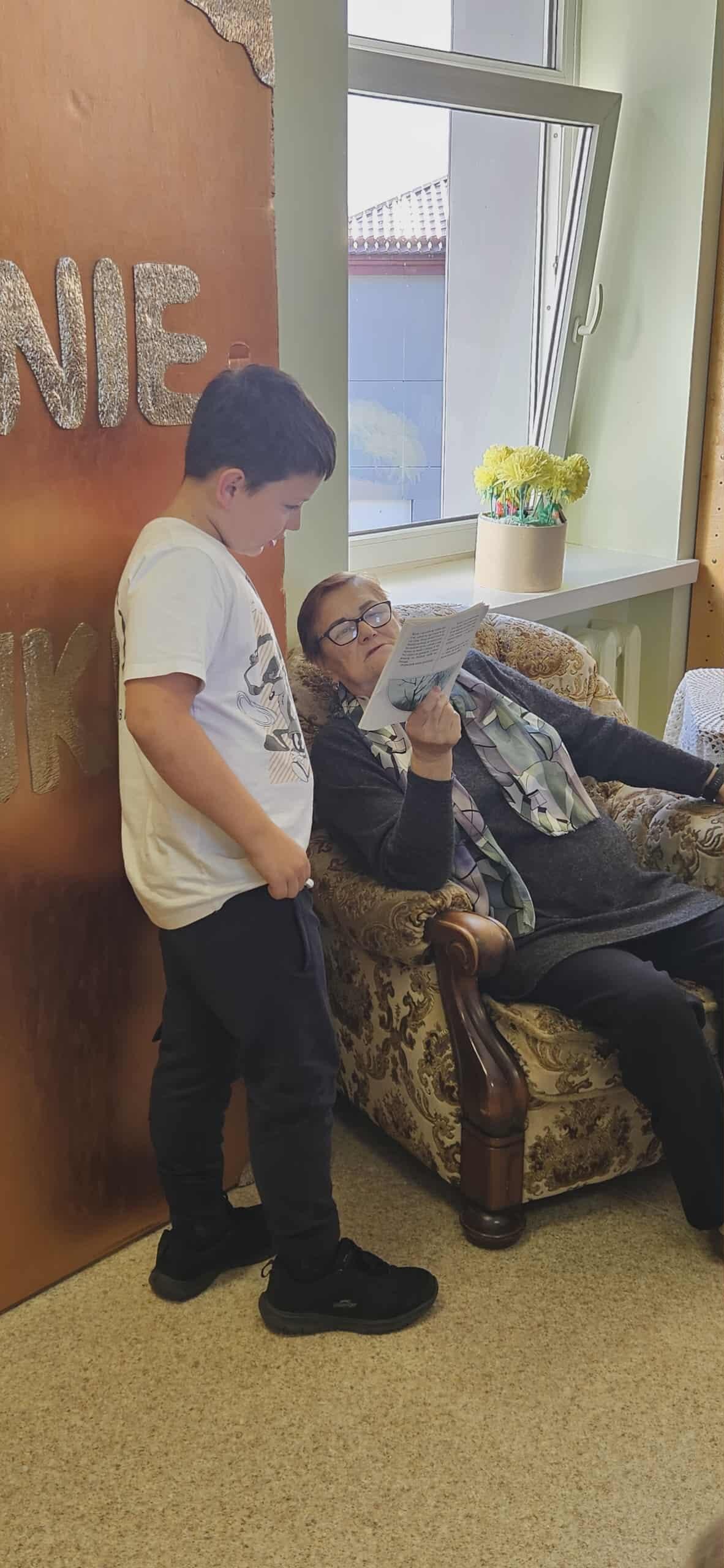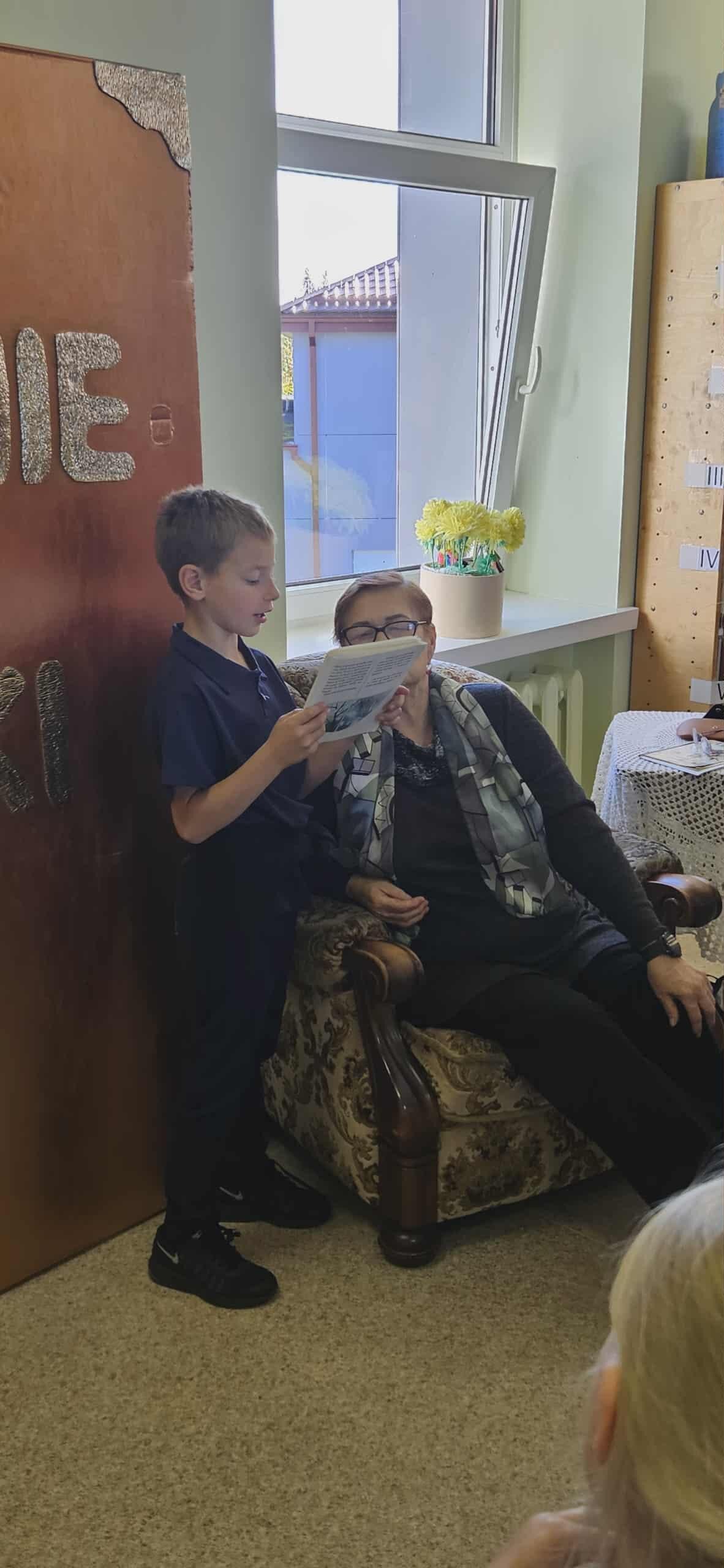 Dzisiaj, podobnie jak w ubiegłym roku szkolnym, do biblioteki Gimnazjum im. Longina Komolowskiego zawitała Babunia. Przeczytała uczniom klas 1–4 bajkę o topielcu, który chciał się ożenić. Dzieci z zachwytem słuchały opowieści, a następnie same, na zmianę, czytały dla Babuni.