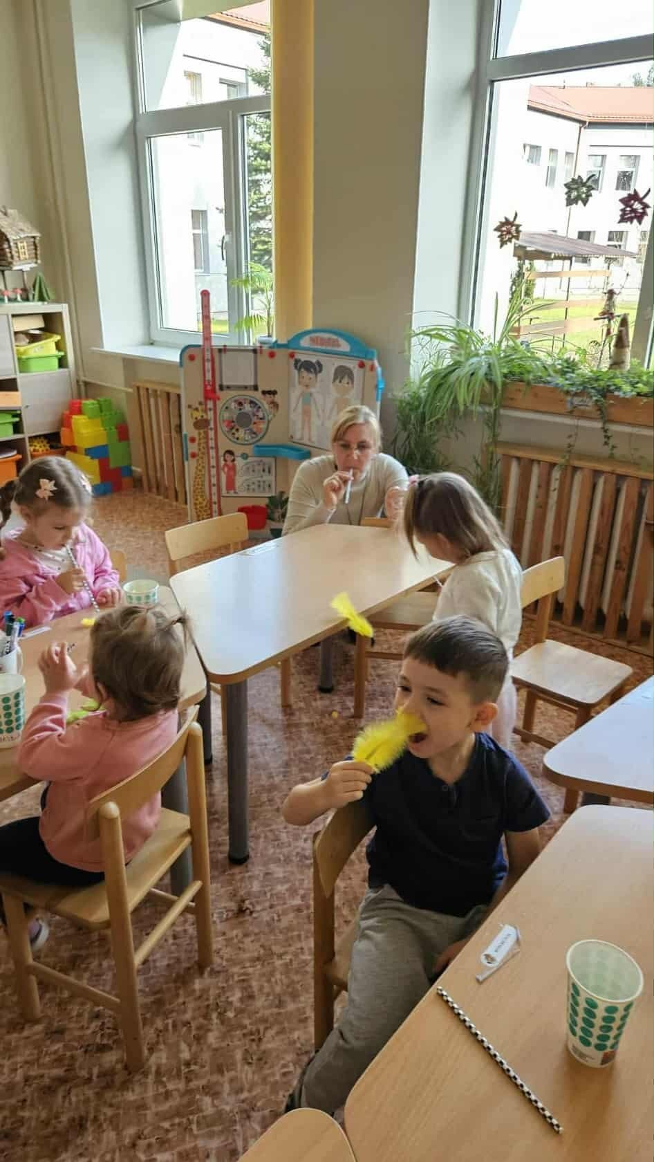 Podczas zajęć dzieci z zaangażowaniem wykonywały różnorodne ćwiczenia: dmuchały na piórka, wiatraczki i piłeczki, a także bawiły się kolorowymi „dmuchajkami”. Tego typu zabawy nie tylko rozwijają prawidłowe oddychanie, ale także pomagają w płynnym mówieniu i relaksacji.