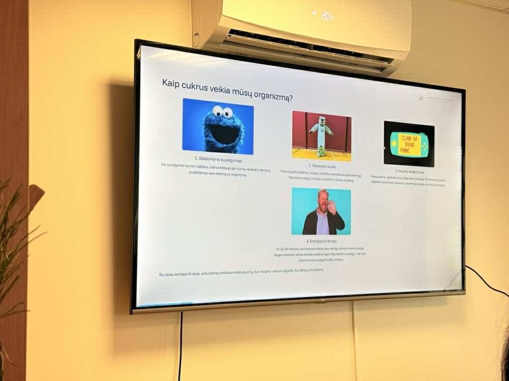 Kartu su specialiste mokiniai lygino, koks turėtų būti rekomenduojamas cukraus kiekis kasdienėje mityboje ir kiek jo iš tiesų suvartojama realybėje. Diskusija virto gyvu, aktyviu pokalbiu, skatinusiu mokinius apmąstyti savo kasdienius pasirinkimus.