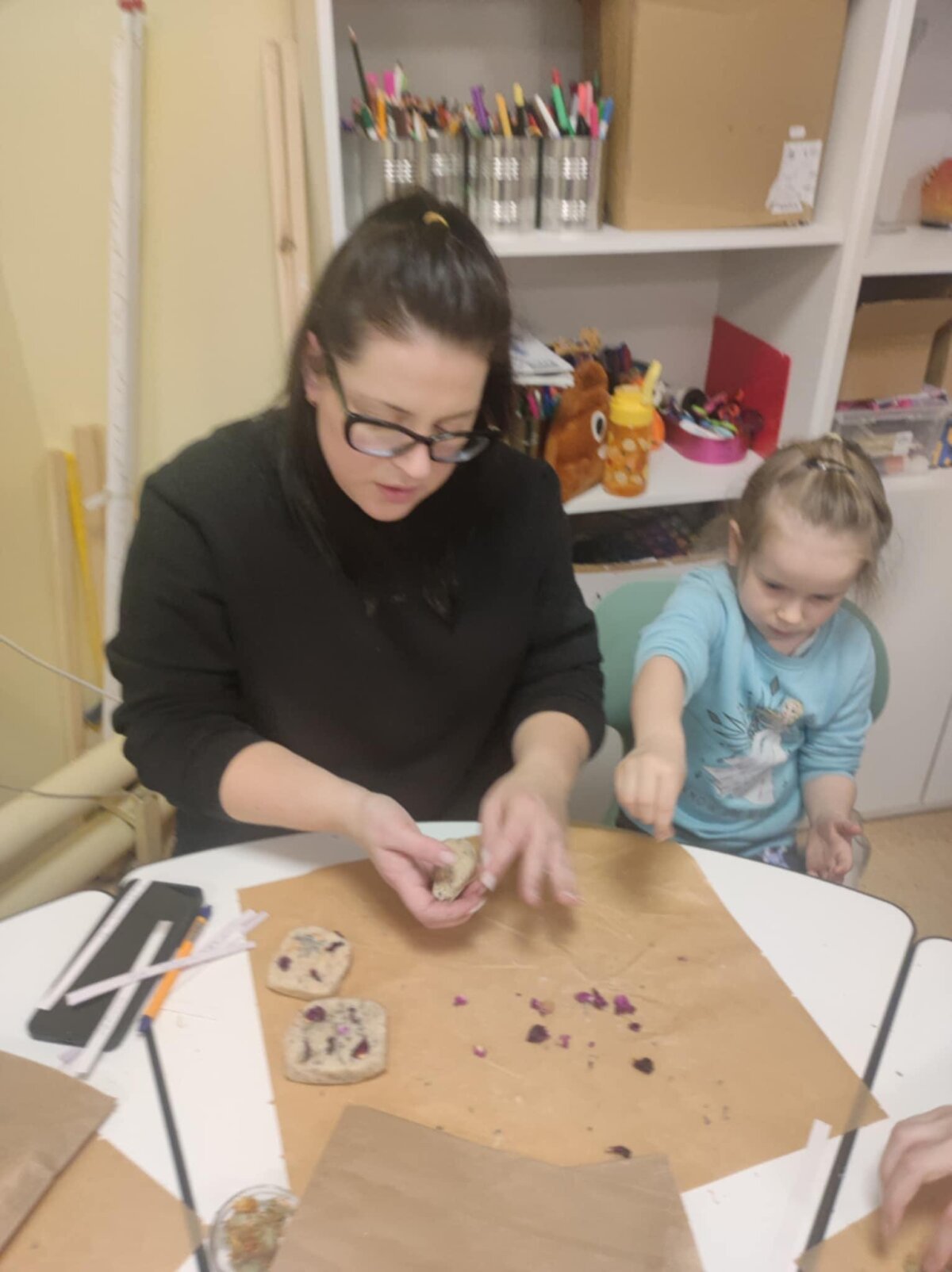 W części praktycznej przedstawiono podstawy tworzenia mydła z olejów roślinnych oraz najważniejsze zasady pracy z nimi. Następnie każdy uczestnik przygotował swoje świąteczne mydełko, dobierając ulubione olejki, dodatki i formę. Powstały unikalne, pięknie pachnące wyroby, idealne na prezent.