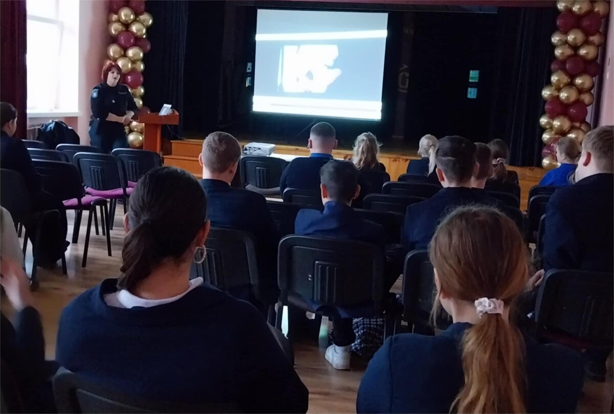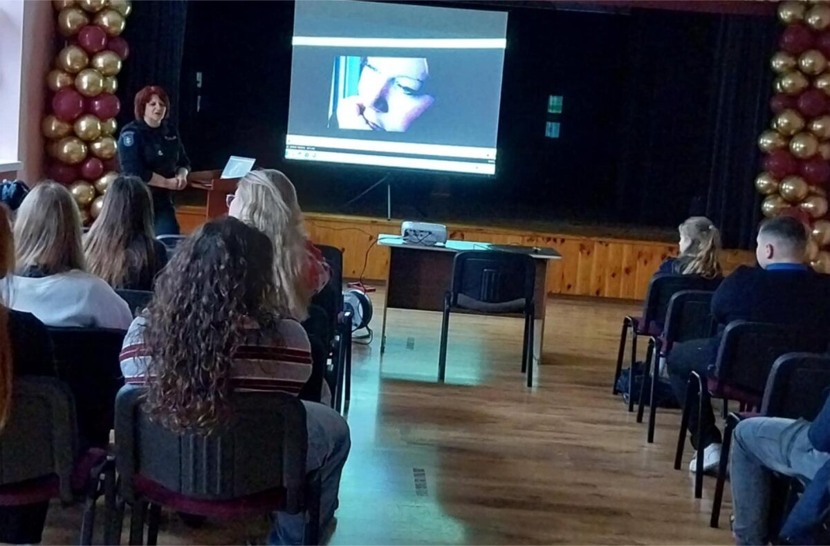 Šiandien gimnazijoje vyko prevencinis renginys 5–10 klasių mokiniams, kurį vedė pakviesta Vilniaus apskr. VPK Trakų r. PK Veiklos skyriaus vyriausioji tyrėja Vlada Černienė.