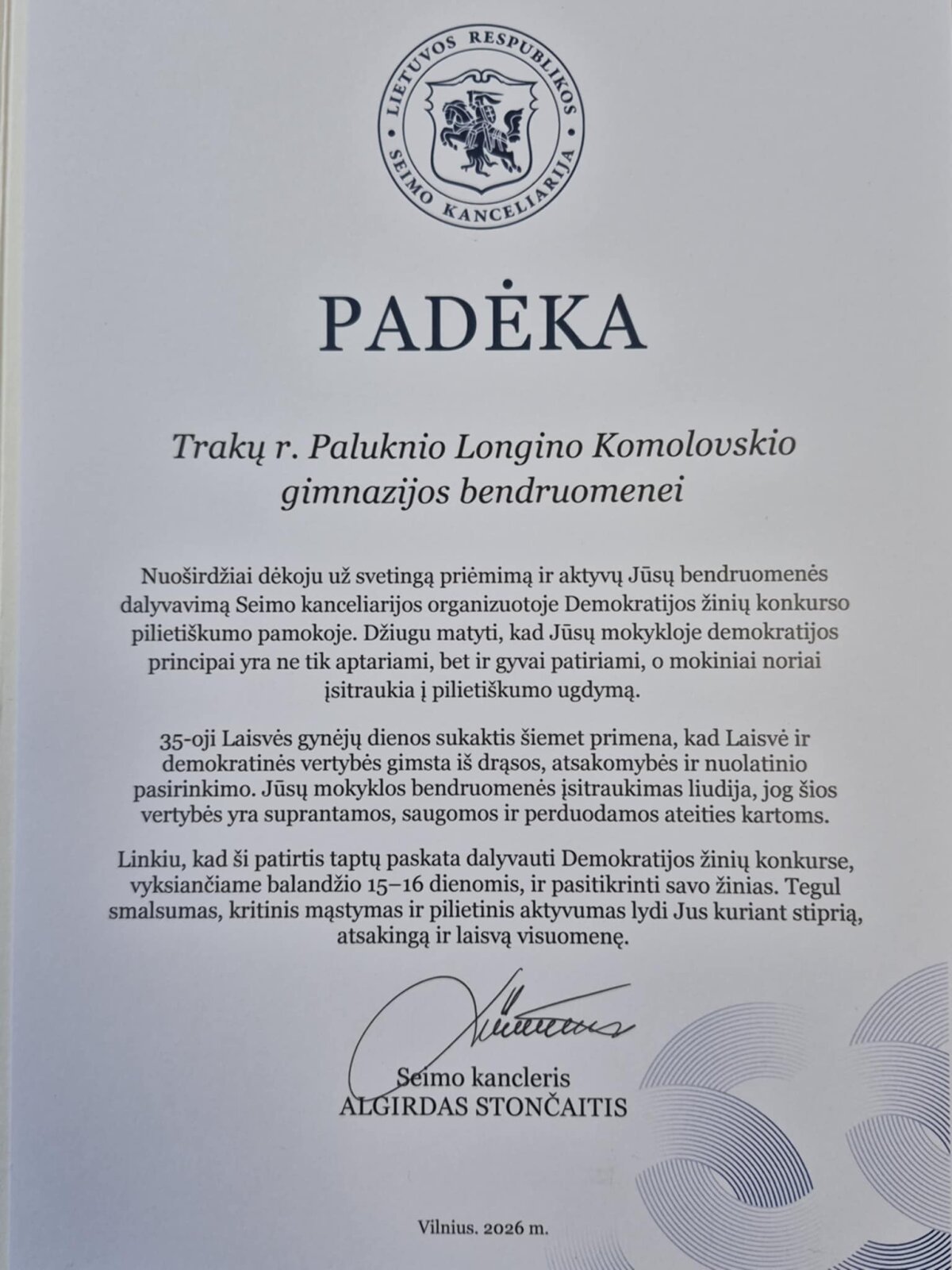 Renginio pabaigoje mūsų mokykla sulaukė padėkos už aktyvų bendruomenės dalyvavimą ir pilietiškumo ugdymą.