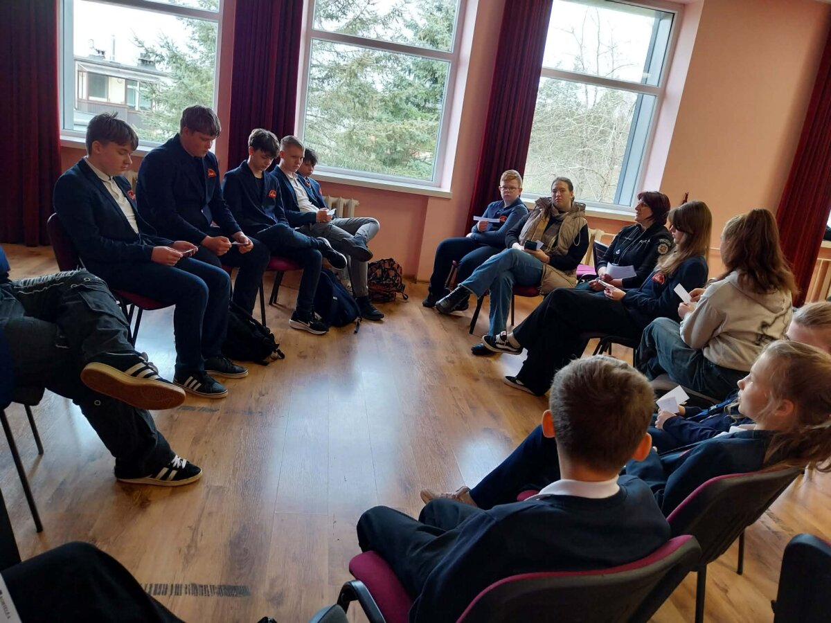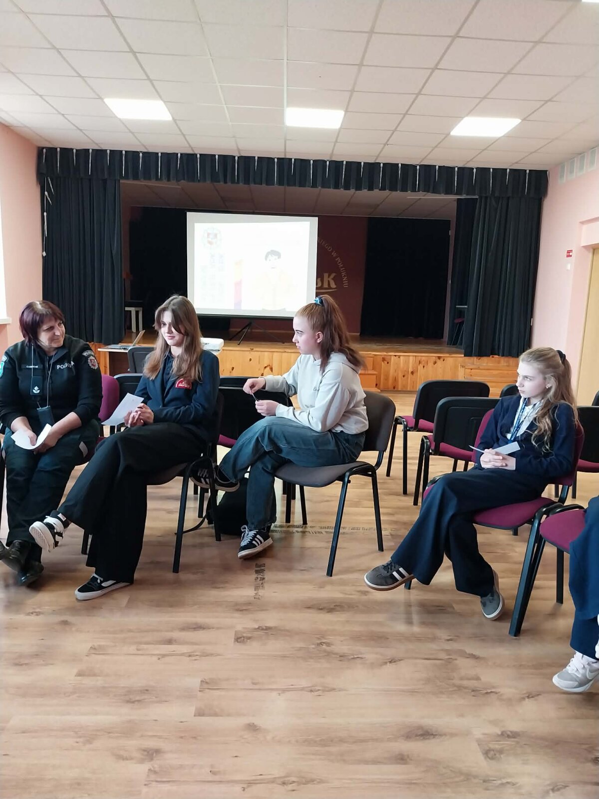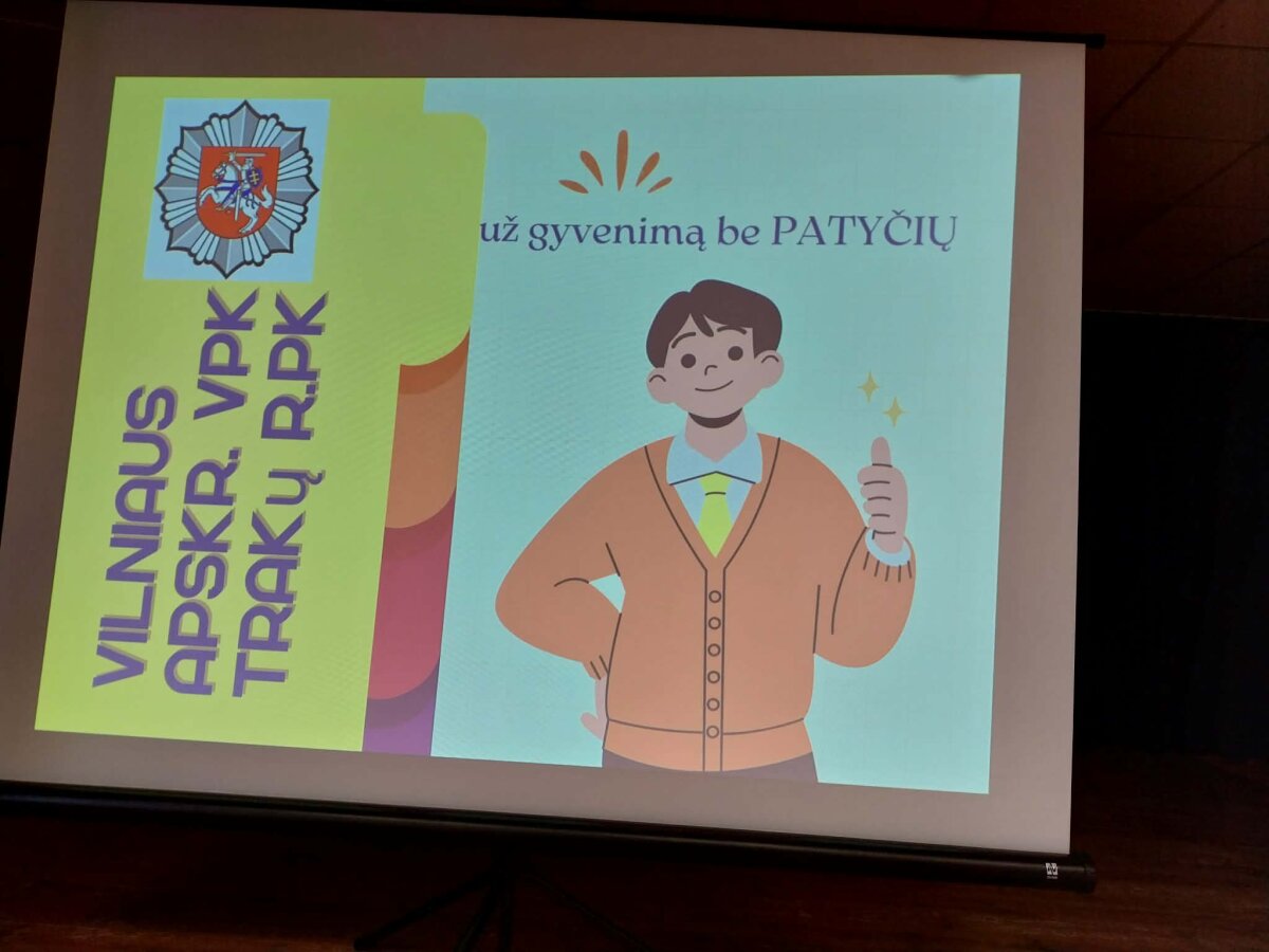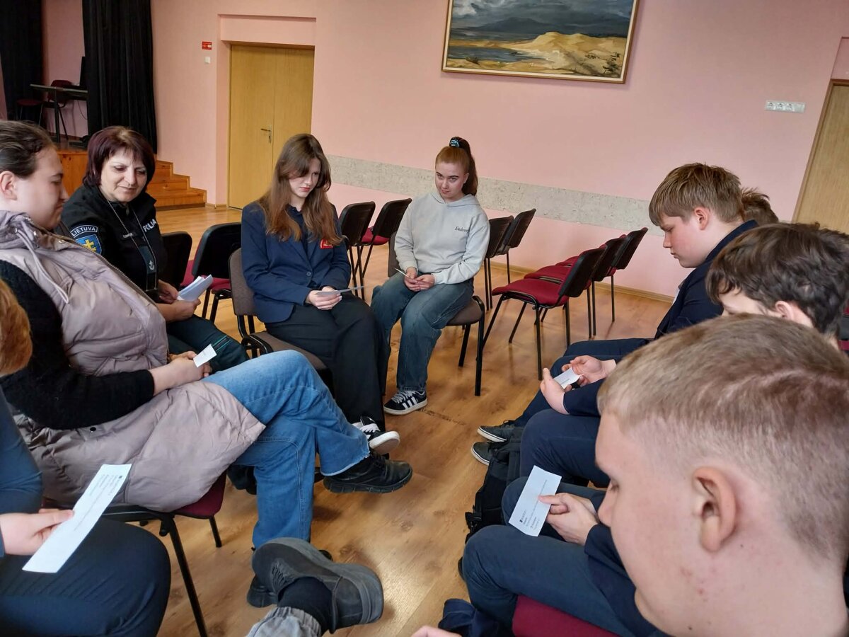 Mokiniai dalyvavo apklausoje apie patyčių situaciją gimnazijoje, savo mintis ir jausmus išreiškė piešiniuose. Ypač prasmingas buvo susitikimas su policijos bendruomenės pareigūne Vlada Černiene – atviras, šiltas pokalbis kamerinėje aplinkoje leido dar kartą pažvelgti į atsakomybę ir pasirinkimus.